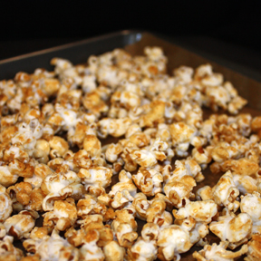 Rub a bowl large enough to hold the popped corn lightly with butter and add popped corn.