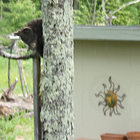 Hoops has seen his fair share of bears and there is a reason why he has lived to see 14 years. He retreated immediately and waited uncharacteristically patiently for breakfast to be served. Meanwhile, I fumbled with my camera, forgetting that it was set on full manual mode. Needless to say, most of my shots were as foggy as my morning brain. Photos or not, I decided watching the bears’ shenanigans was a delightful way to wake up and start the day. But when mom stood up tall to knock out a glass block window and junior started swinging from the window box, my husband Mark decided it was time to bust up the fun. He shooed them away. Mom ran off but the kids followed their instincts and went straight for the nearest tree. Eventually they shimmied down to chase after mom.