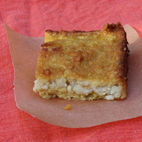 I’m not sure exactly what occurred during the baking process, but it is almost like the crust and the filling traded places. Still it works. And the bars are just firm enough that you can pick them up and eat them with your hand. Next time I might even double the crust and push it further up the sides of the pan.