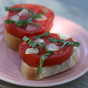Slice the bread. Spread on a generous layer of mayo (this is no time to be shy). Add tomato slices, garlic slivers, and basil. Sprinkle with a flourish of Jane’s. Go crazy. Summer comes but one a year.