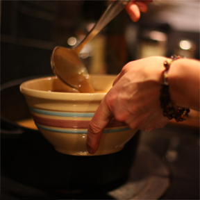 I was genuinely dismayed when I was called away into the “real” kitchen to help get dinner on the table. The Angry Chef’s kitchen was so much more spirited! The real kitchen, however, turned out much better fare. Crispy, salt-brined kosher turkey, wild rice and mushrooms, roasted garlic with blue cheese, tart cranberries, baked winter squash with a splash of maple, and browned-butter mashed potatoes. Even the crankiest of chef’s would have been pleased.