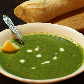 This recipe is an adaptation from Zuni Café in San Francisco, via one of my favorite food blogs, Orangette. I usually sacrifice at least a baker’s dozen (sometimes more) of garlic plants for the soup. If you don’t have your own garlic plot to contemplate pilfering, (or even if you do, but happen to have more restraint than I do) fear not. This is the time of year you are likely to find green garlic shoots at farmer’s markets and other places that sell local produce. You’ll want to use just the tender white and pale green parts of the plant. Save the tougher green tops for use in a vegetable stock if you’re so inclined. You could also try the soup with regular garlic, but I would use just a few cloves, minced and simmered just a titch longer. It’d still be a lovely way to celebrate that long awaited spring spinach.